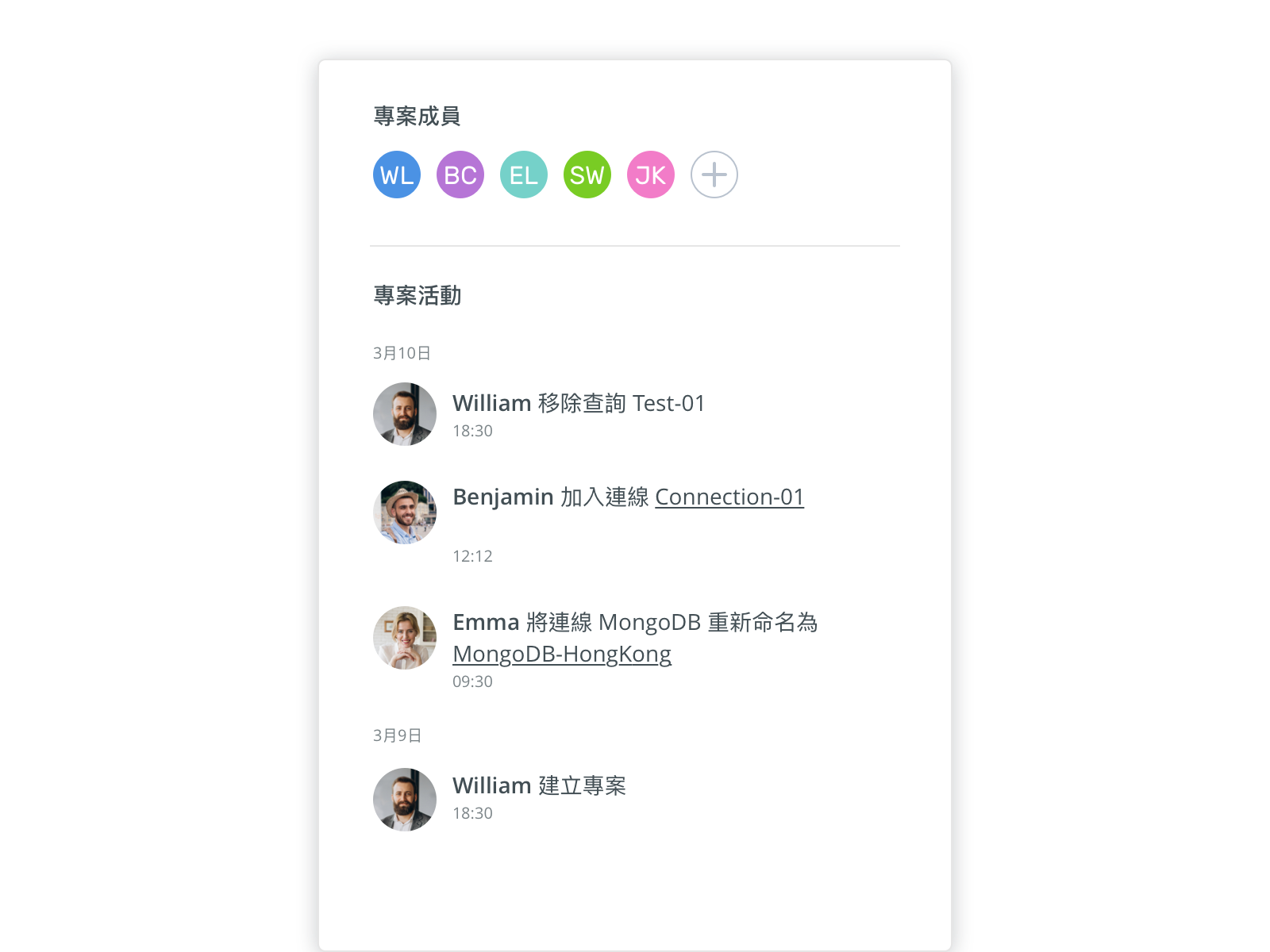 所有涉及協同合作的活動都即時記錄在活動記錄中。這使你能夠快速檢視專案中的所有活動。你也可以監督特定團隊成員最近的活動,並且每位成員都可以清晰了解每個人的工作狀況。