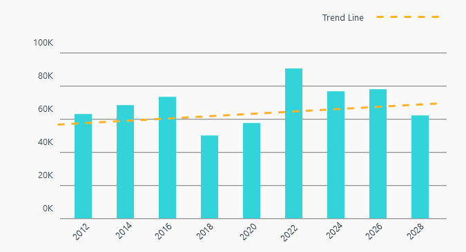 從 Navicat 16.1 開始,你可以在直條圖、橫條圖、折線圖、區域圖、條形與折線圖和散佈圖中加入趨勢線。為了令圖表更加易於理解和解釋,你可以變更趨勢線的預設外觀。只需按一下「內容」窗格中的「趨勢線」索引標籤。