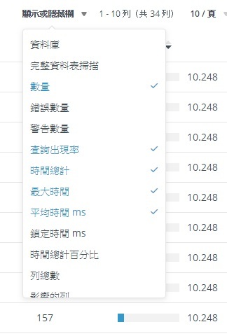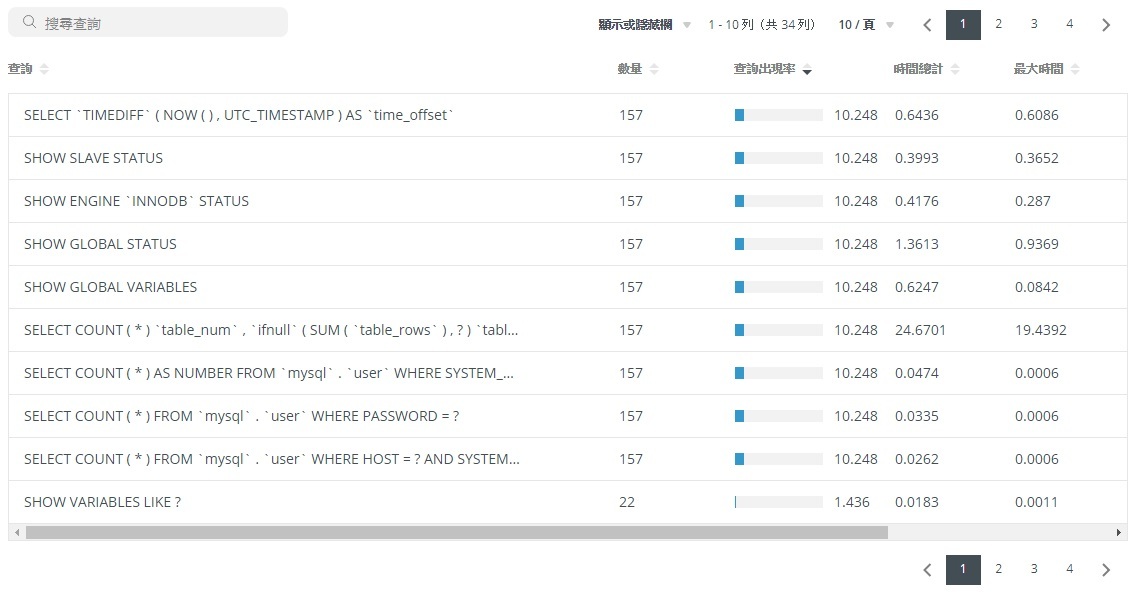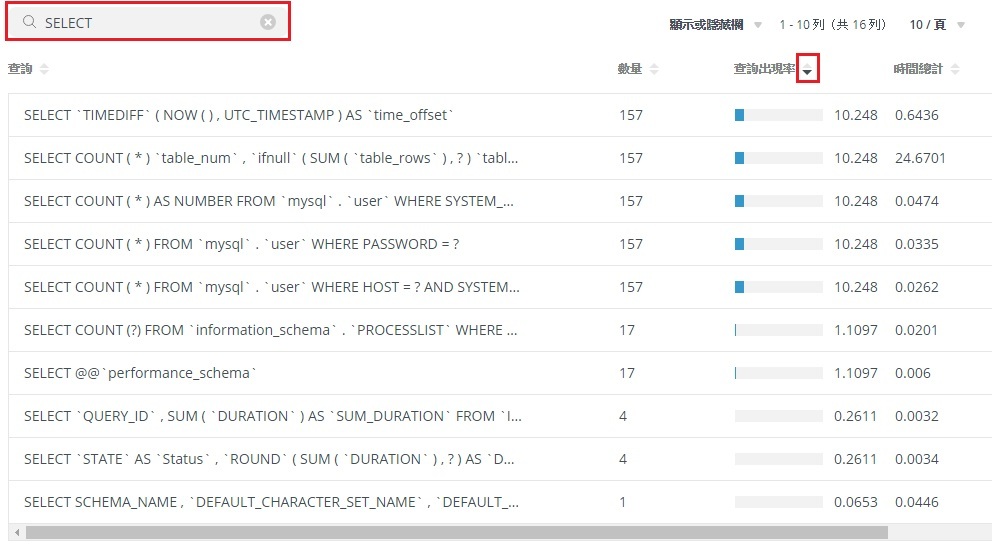 查询表格提供所有已執行查詢的摘要資料。計算的統計資料包括數量、查詢出現率、時間總計等等。