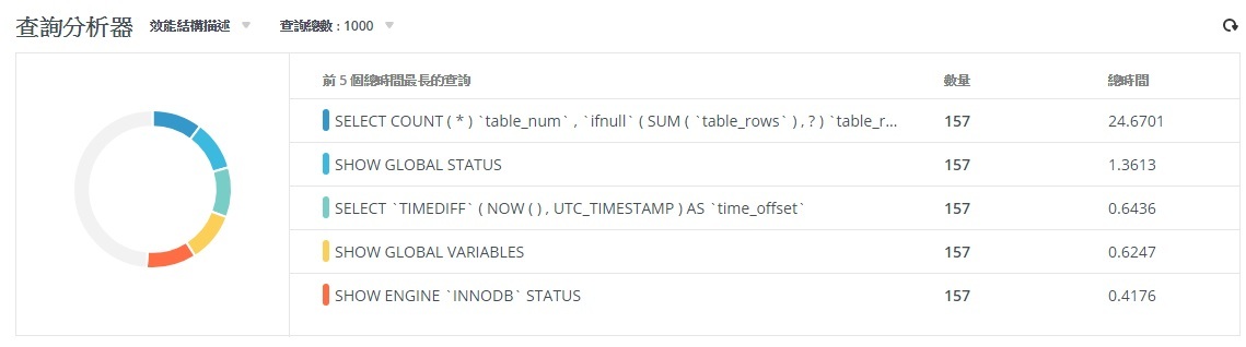 此部分顯示最耗時的 5 個查詢,以及色彩編碼的環圈圖,可讓你快速了解潛在問題。你可以隨時按一下重新整理按鈕以更新前 5 個查詢清單。