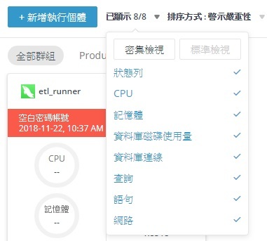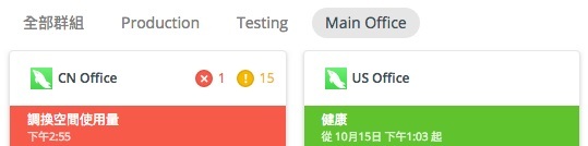 密集檢視顯示執行個體名稱,以及重大和警告警示的數量。如需要更多資訊,可選擇標準檢視。標準檢視中的每張卡片都會顯示一個綠色、橙色、紅色或灰色的狀態列,執行個體的狀態均能一目了然地顯示出來。這些色彩對應的狀態分別是健康、警告、重大和暫停。這使你很輕鬆地就能識別需要立即關注的執行個體。你可以按一下狀態列以查看該執行個體的所有警告和/或警示。