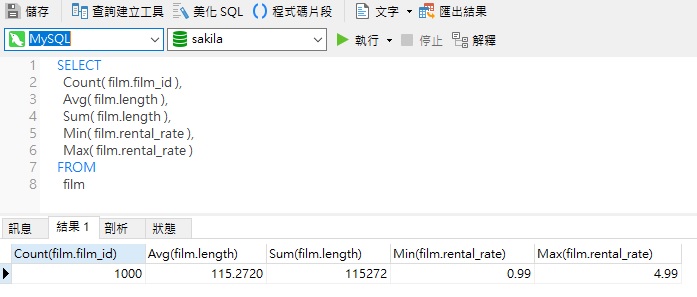 這查詢使用彙總函式顯示電影數量、平均電影長度、電影總長度以及最低和最高出租率: