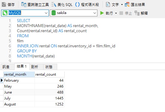 請留意如何在 rental_month 輸出欄位上套用 MONTHNAME 函式顯示完整的月份名稱而不是 MONTH() 函數傳回的數字。無論如何,你可以使用任一種函式根據月份分組結果。