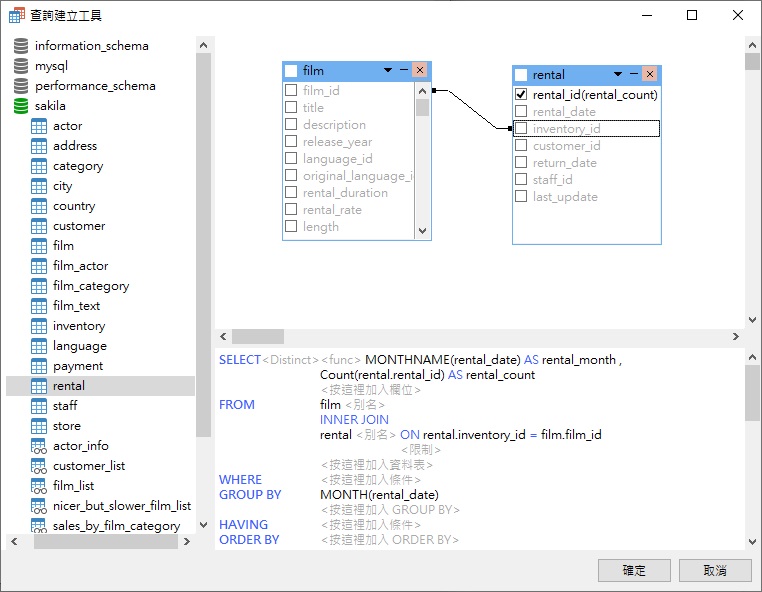 - 將 film.film_id 欄位拖至 rental.inventory_id 欄位上以聯結兩個資料表。