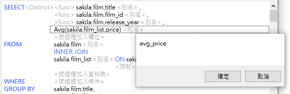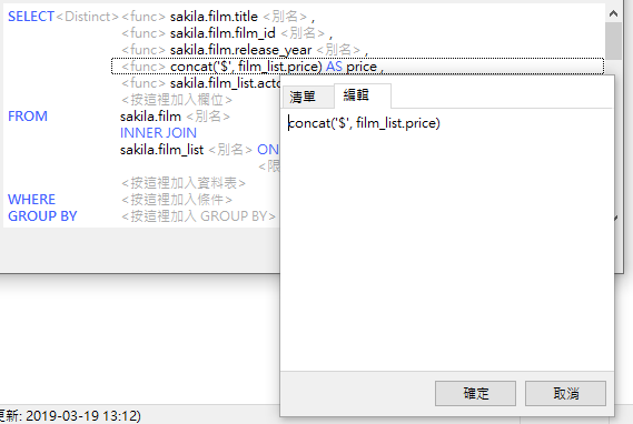按一下 <func> 修飾詞將開啟 SUM、MAX、MIX、AVG 和 COUNT 彙總函式的清單。你也可以在「編輯」索引標籤輸入其他函式。例如,我們可以選取 film_list.price 欄位並在「編輯」索引標籤中輸入「concat('$', film_list.price)」以加入貨幣符號。我們也可以拖動欄位來移動它的位置,例如,移動到 actor 清單之前: