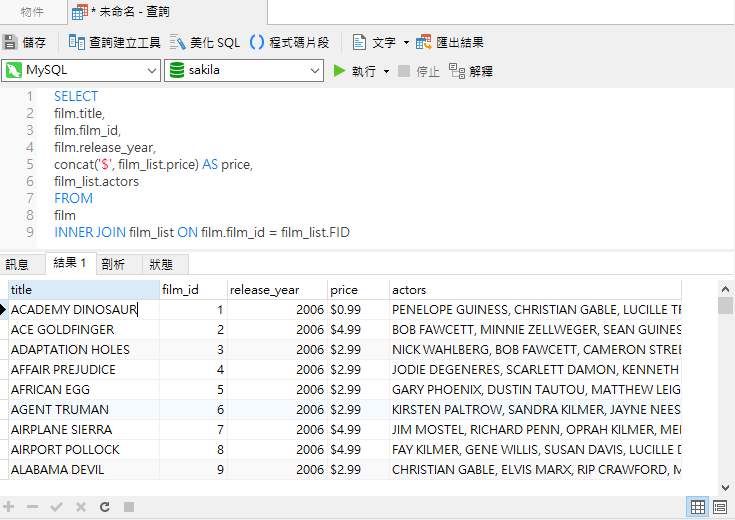 按一下要在查詢結果中顯示的每個欄位旁邊的核取方塊,即 film.title、film.film_id、film.release_year 和 film_list.actors。