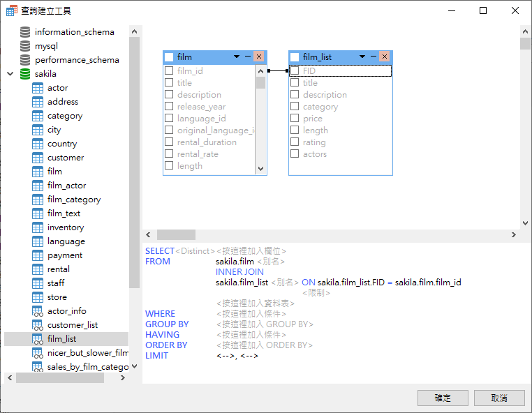 將資料表或檢視從左窗格拖到「圖表設計」窗格,或者按兩下它以將其加到查詢中。查詢建立工具將自動包含已宣告了外部索引鍵條件約束的實體關係。在這個例子,我們需要 film 資料表和 film_list 檢視。他們之間沒有定義的關係,所以我們必須自己加入一個。要做到這一點,只需將一個欄位從一個物件拖到另一個物件,連結的欄位(即 film.film_id 和 film_list.FID)之間將出現一條線。