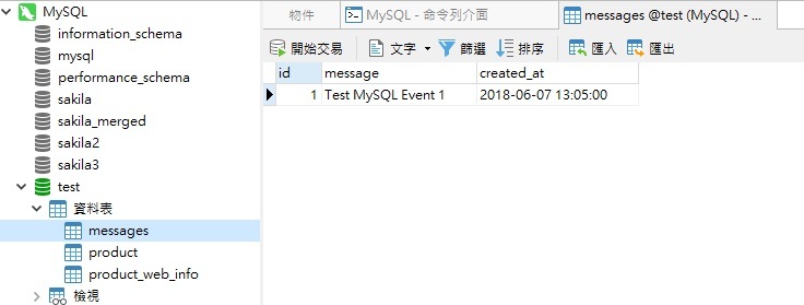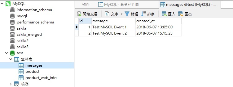讓我們使用上面的語法建立一個實際的事件。我們將定義和安排一次性事件,將訊息插入名稱為 messages 的資料表中。