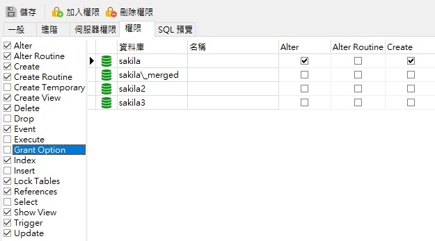 想要指派特定資料庫的權限?你可以在「權限」索引標籤執行此作業。它顯示連線中每個已註冊的資料庫以及列出權限清單。以下的「權限」索引標籤指派 Sakila 資料庫的 Create、Drop 和 Alter 權限給使用者: