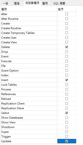 此索引標籤包含一系列適用於整個伺服器連線的權限。若要指派權限給使用者,只需對照列出的伺服器權限勾選該選項。例如,以下配置指派整個伺服器的 Select、Update、Insert 和 Delete 權限給新使用者 bob_s@localhost: