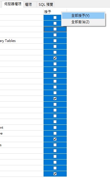 你可以在「伺服器權限」索引標籤上的任何位置按一下滑鼠右鍵並從內容功能表中選取適當的選項,一次授予和撤消所有列出的權限,而不是選取個別的核取方塊: