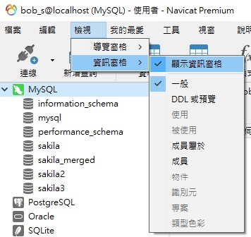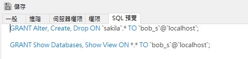 現在,新使用者 bob_s@localhost 除了有整個伺服器的 Select、Update、Insert 和 Delete 權限外,還有 Sakila 資料庫的 Create、Drop 和 Alter 權限。
