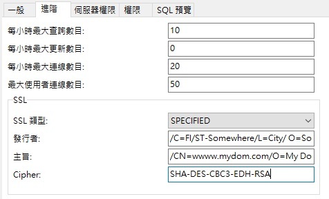 這些等同於「進階」索引標籤中的欄位:「每小時最大查詢數目」、「每小時最大更新數目」、「每小時最大連線數目」和「最大使用者連線數目」。這些欄位每一個都接受零(0)或正整數的值。