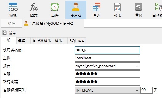 - 加密「插件」。從下拉式清單中選擇「mysql_native_password」或「sha256_password」。
