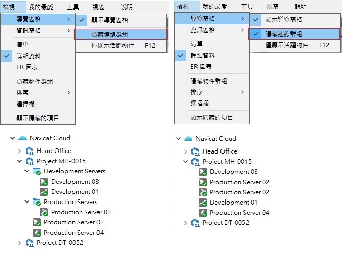 最後,從主要功能表中選擇「檢視」->「導覽窗格」->「隱藏連線群組」,可以在導覽窗格中隱藏群組結構。