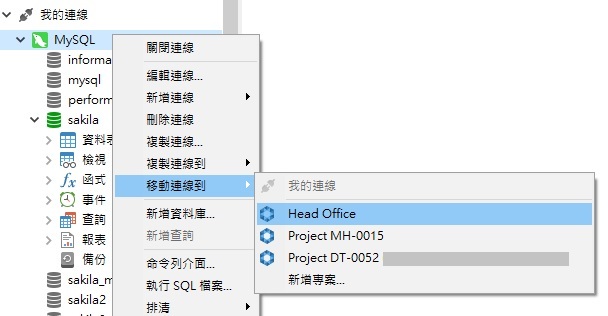 所有 Navicat Cloud 物件都位於不同的專案下。不同的 Navicat Cloud 帳號可以共用專案以實行協同合作。通常,你需要將本機連線移動或複製至專案以共用連線。這是所需的步驟:
