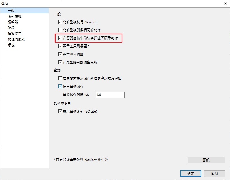 請注意,「在導覽窗格中的結構描述下顯示物件」選項不會影響目前活躍的連線。