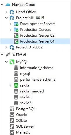 在登入 Navicat Cloud 功能後,導覽窗格會分為「Navicat Cloud」和「我的連線」兩部分。