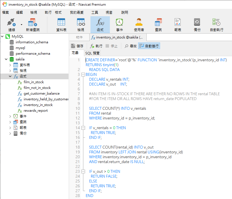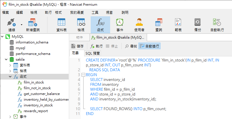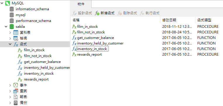 在 Navicat 資料庫管理和開發工具中,你可以在「函式」下看見資料庫的程序和函式。預存程序具有「Px」圖示,而函式具有「fx」圖示: