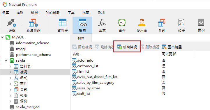 在 Navicat 中,你可以按一下主要工具列上的「檢視」按鈕,然後按一下物件工具列上的「新增檢視」來建立新檢視: