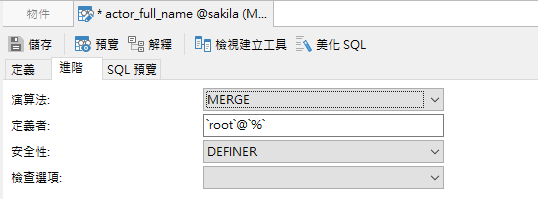 - MERGE 演算法將輸入查詢與定義檢視的 SELECT 語句組合成一個查詢。MySQL 然後執行組合查詢以傳回合併的結果集。MERGE 演算法不能套用於包含彙總函式(MIN、MAX、SUM、COUNT、AVG)或DISTINCT、GROUP BY、HAVING、LIMIT、UNION 和 UNION ALL等的 SELECT 語句。如果無法套用 MERGE 演算法,MySQL 會自動將演算法變更為 UNDEFINED。