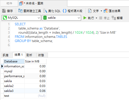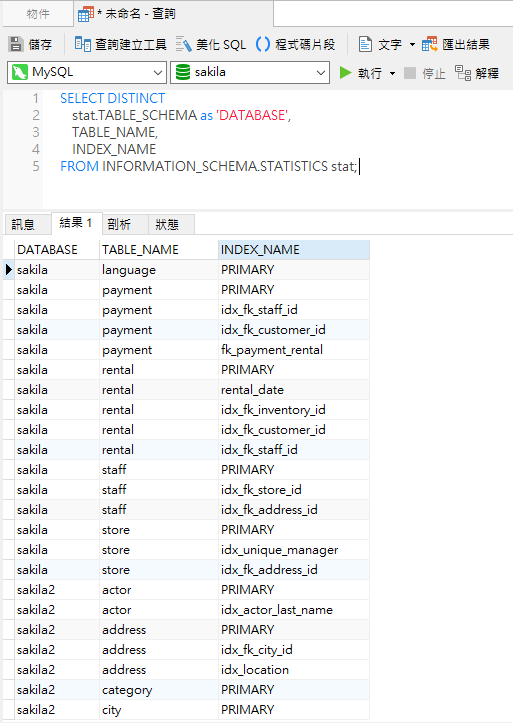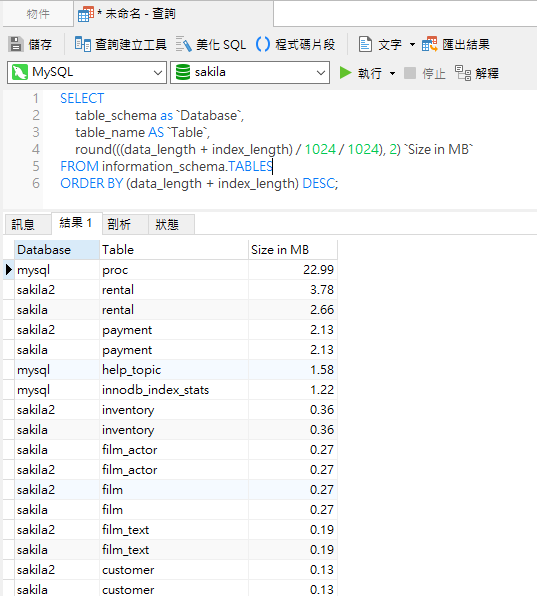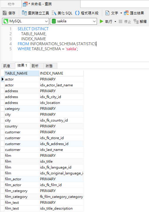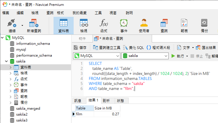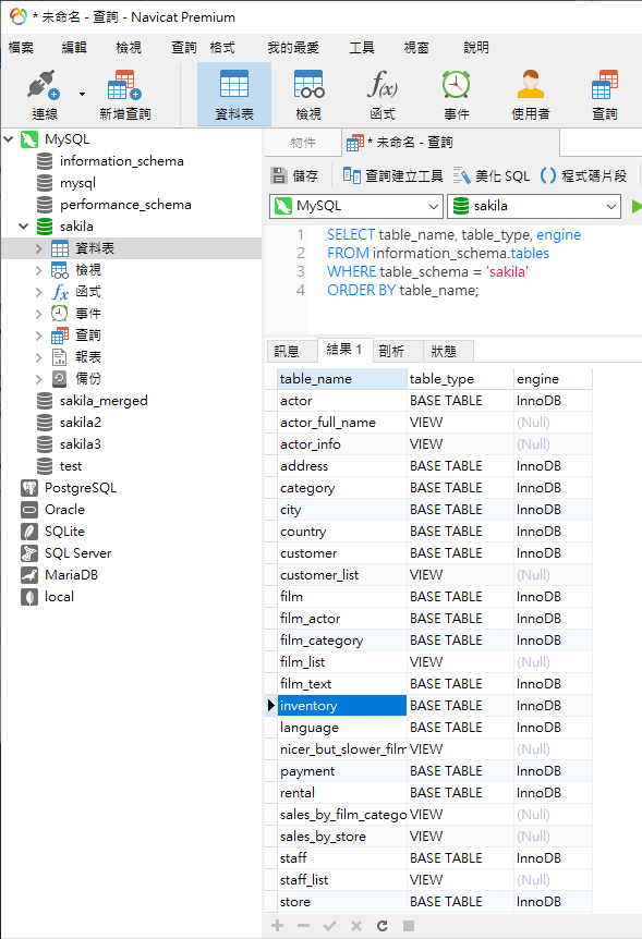 以下是 Navicat 中 sakila 資料庫的結果: