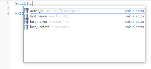 現在,當我們輸入較短的資料表別名時,Navicat 會顯示一個包含所有資料表欄的自動完成清單: