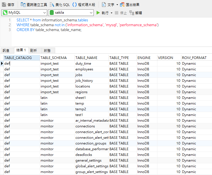 MySQL 的語法有點冗長,因為你必須指定系統資料庫才能省略它們的資料表: