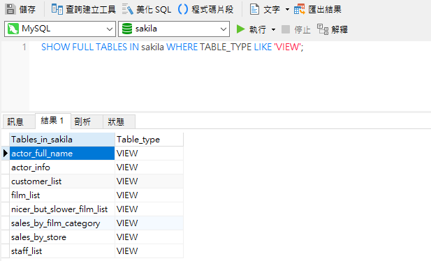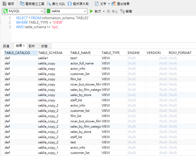 在 MySQL 中,我們可以透過將 TABLE_TYPE 限制為 'VIEW' 來將清單縮窄至檢視。我們仍然必須排除 sys 資料庫,因為它包含許多檢視: