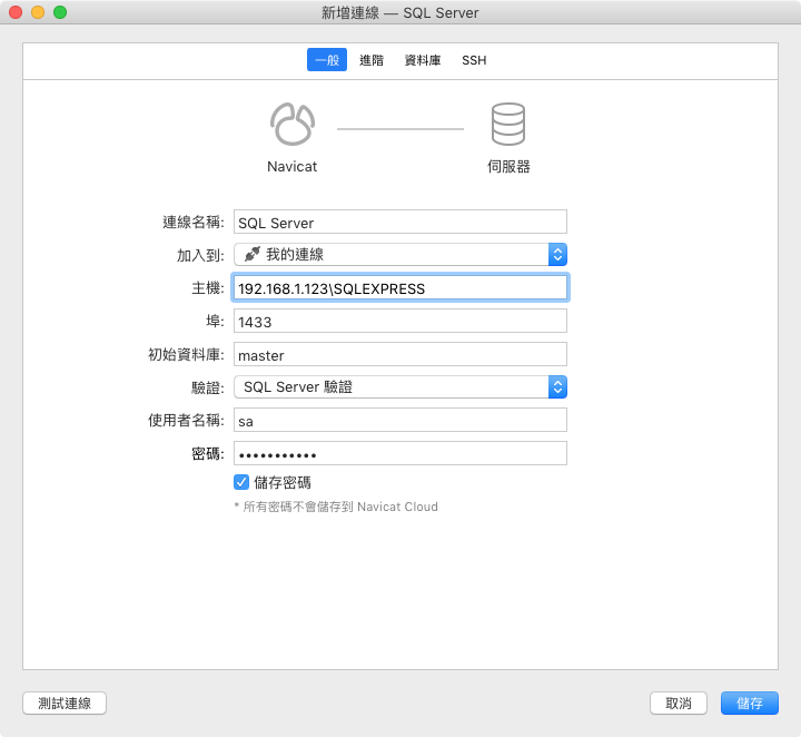 建立與多個資料庫的連線並非易事,因為每個資料庫產品都有自己的連線參數。例如,某些資料庫需要預設資料庫,而其他資料庫則不需要。Navicat 透過為每種資料庫類型提供一致的「連線」對話方塊來撫平這些差異,螢幕之間只有一些微小的變化。以下是 Windows 上 MySQL 的「新增連線」對話方塊和 macOS 上 SQL Server 的「新增連線」對話方塊的比較:
