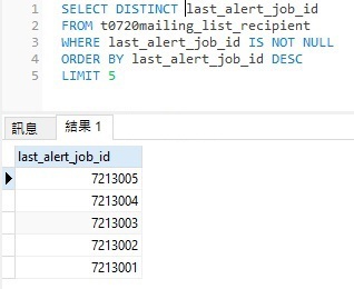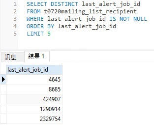 若要傳回後 5 個唯一 Job ID,你需要做的就是刪除 ORDER BY 子句中的 DESC 修飾詞。根據預設,這將以遞增(ASC)順序排序記錄: