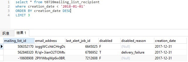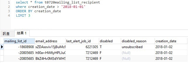 你可以使用 LIMIT 找到特定日期最接近的列。只需比較列日期與特定日期,排序結果,並將結果限制為你希望尋看的列數。以下的查詢傳回 creation_date 大於 '2018-01-01' 的列: