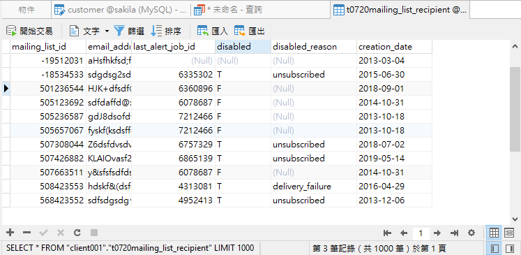 Navicat 開發和管理工具根據預設會自動限制結果集,以防止對資料庫伺服器造成過度負擔。當開啟資料表時,你可以看到它的運行情況。在應用程式視窗的底部,顯示了 Navicat取得資料表列時執行的SQL。它以「LIMIT 1000 OFFSET 0」結尾,這意味著只顯示最前的 1000 筆記錄。