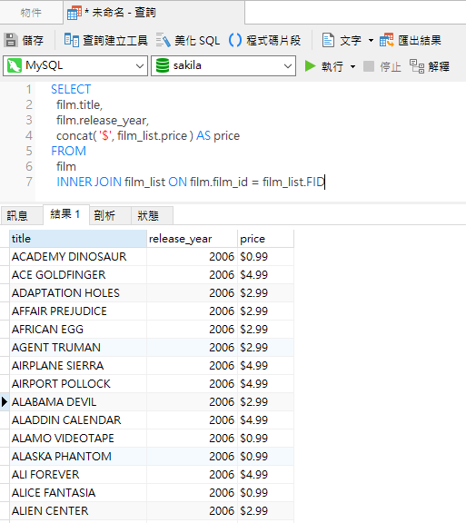 這個查詢選取一個電影標題以及它們的發行年份和租借價格的清單:
