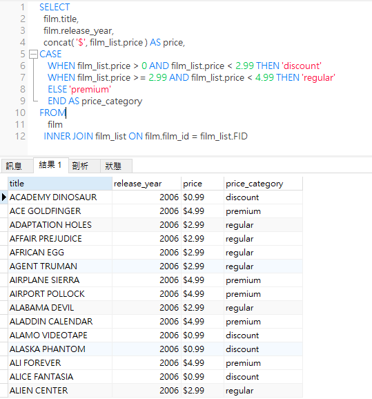 CASE 是一個流程控制陳述式,它的作用與 IF-THEN-ELSE 陳述式非常相似,可根據資料選擇一個數值。CASE 陳述式會通過條件檢查,並在滿足第一個條件時傳回一個數值。因此,一旦條件為 True 時,CASE 陳述式將會停止,從而略過後面的子句,並傳回結果。正如我們在今天的文章中看到的那樣,它可以用來測試條件和離散值。