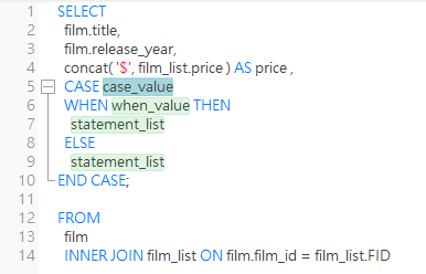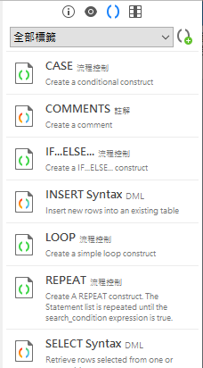 為了幫助使用 CASE 陳述式,Navicat 提供了程式碼片段功能,你只需將程式碼片段拖放至 SQL 編輯器即可。雖然你可以建立自己的陳述式,但 Navicat 附帶了許多標準 SQL 陳述式,包括 DDL 和流程控制的陳述式。實際上,你可以在流程控制清單的頂部找到 CASE 陳述式: