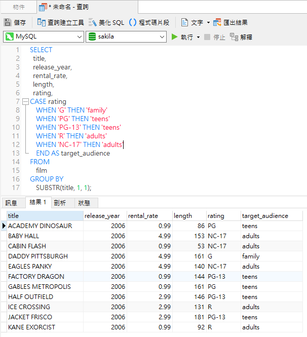 第二種 CASE 語法非常適合針對兩個或多個條件測試離散值。例如,我們可以使用它根據電影評級加入一個目標觀眾欄: