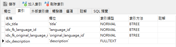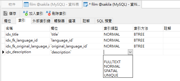 透過將 FULLTEXT 索引加到 description 欄,我們可以在資料表加入全文檢索搜尋功能。我們可以發出 ALTER TABLE 或 CREATE INDEX 命令,但 Navicat 有一種更簡單的方法!就是資料表設計器,它有多個與不同資料表物件有關的索引標籤,其中包括列欄定義、索引、外部索引鍵、觸發器、選項等。我們可以使用「欄拉選取器」對話方塊選擇 description 欄位,然後從「索引類型」下拉式清單中選擇「FULLTEXT」來加入全文索引: