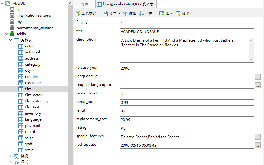 在 Sakila 範例資料庫中,film 資料表包含有關商店電影收藏中每部電影的資訊,包括其標題、放映時間和描述。 我們可以使用「表單檢視」詳細檢視 film 資料表的記錄。只有完整版本提供表單檢視功能,可讓我們以表單的形式檢視、更新、插入或刪除資料,以詳細資料顯示目前記錄。還有導覽列可以讓你快速切換記錄。.