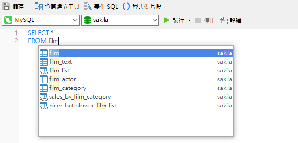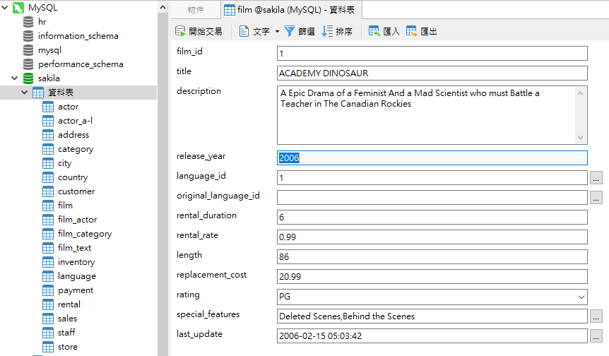 Sakila 範例資料庫代表一個虛構的 DVD 出租商店。film 資料表包含有關商店藏品中每部電影的相關資訊。它的欄包括電影的標題、發行年份、放映時間和描述。這是 Navicat 中表單檢視所顯示的範例列。它允許你以表格的形式檢視、更新、插入或刪除資料,其中目前記錄顯示為欄位名稱及其數值: