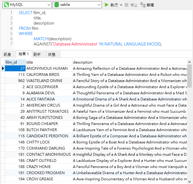 這是片語“Database Administrator”的最終查詢和結果。關於 DBA 的電影數量驚人地多!