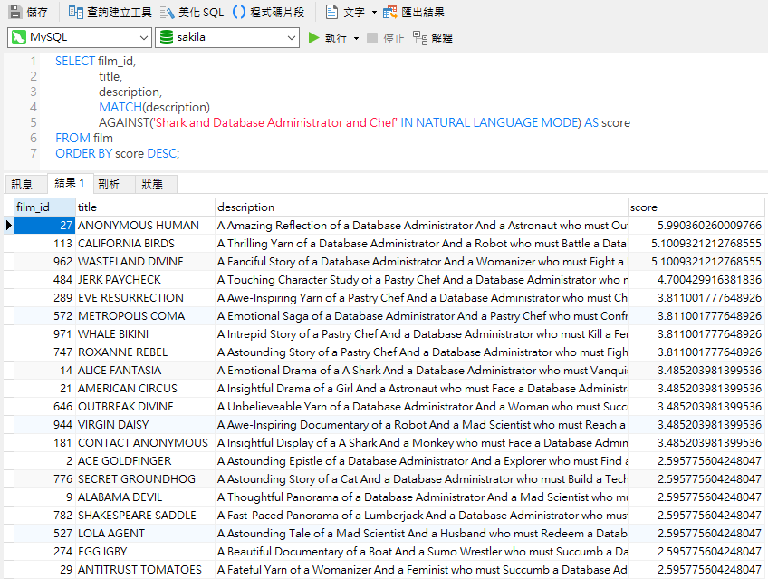 如上所述,使用零加正浮點數值確定相關性,其中零表示沒有相似性。我們可以透過將 MATCH() 和 AGAINST() 函式加到欄清單中來檢視每個記錄的分數,例如: