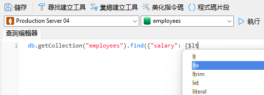 邏輯運算子現在可於 MongoDB 的自動完成程式碼中使用。