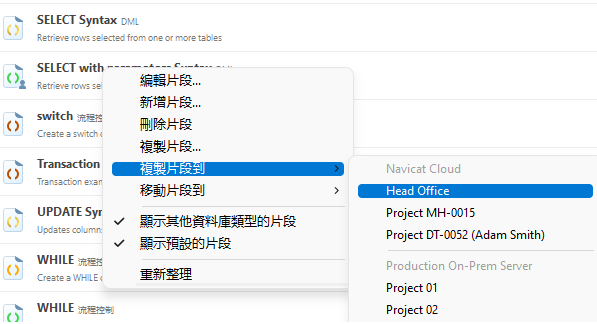 在編寫 SQL 時,你可能會在編輯器中插入可重用的程式碼。如果你想在雲端中分享你的程式碼片段,可以使用「程式碼片段」窗格中的新操作「複製片段到」。