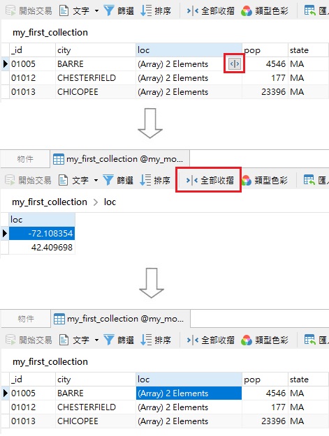 在網格檢視中,陣列會顯示為「(Array) [N] Elements」。但是,這並不表示我們無法檢視它的內容。我們可以將游標移到包含陣列的儲存格上,[<|>]展開按鈕會出現在儲存格的右邊。按一下它就可以深入陣列以檢視它的元素。這個程序可以不斷繼續,直到顯示最內層的陣列為止。同時,我們可以隨時按一下[>|<] 全部收摺按鈕返回最頂層(即集合):