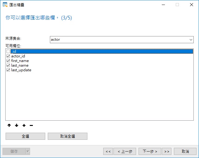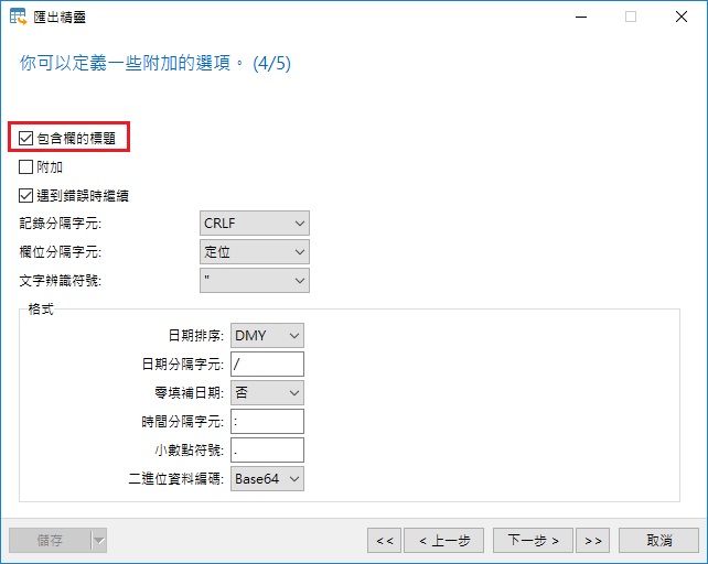 - 匯出精靈的第四步讓你指定是否將欄標題匯出為資料的第一行。我們會建議你勾選“包含欄的標題”方塊,因為這樣可讓你更輕鬆地將資料匯入回資料表: