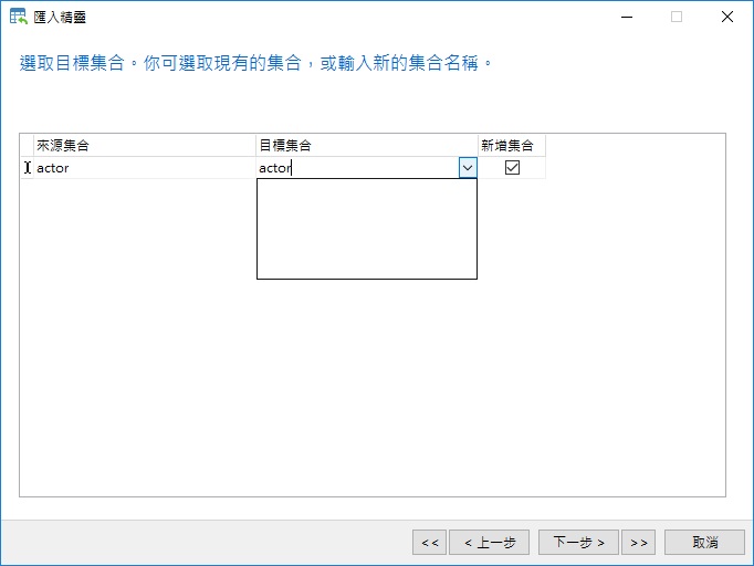 - 在設定目標集合的步驟中,你可以選擇現有的集合或新的集合。若要建立新的集合,只需在「目標集合」欄位中輸入集合名稱。這將自動勾選「新增集合」方塊: