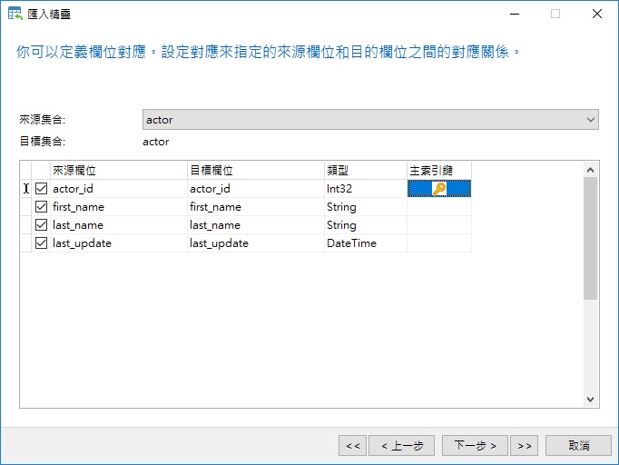 - 在欄位對應的步驟中,你可以選取要匯入的欄位和它的資料類型。這步驟顯示來源和目標欄位,以便你可以比較後者的資料類型的結果。你還可以指定哪些欄位為主索引鍵欄位: