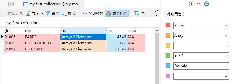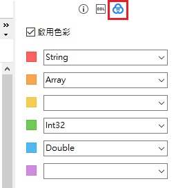 如果網格視窗停在 Navicat 主視窗中,按一下「資訊」窗格中的「類型色彩」圖示就能顯示色彩對應欄位: