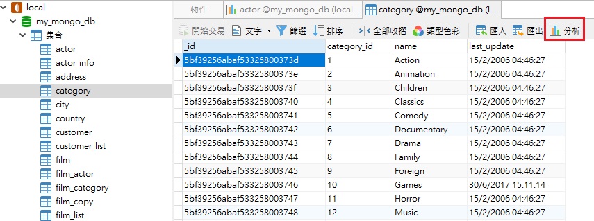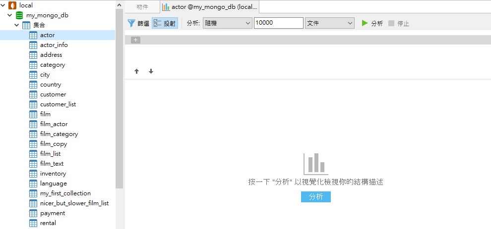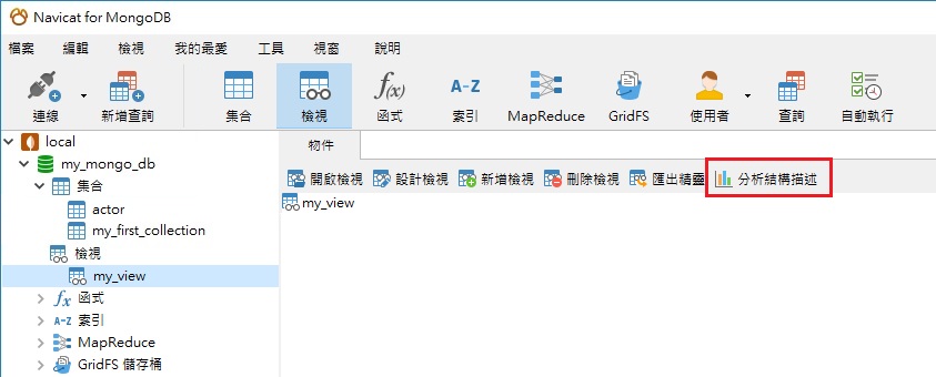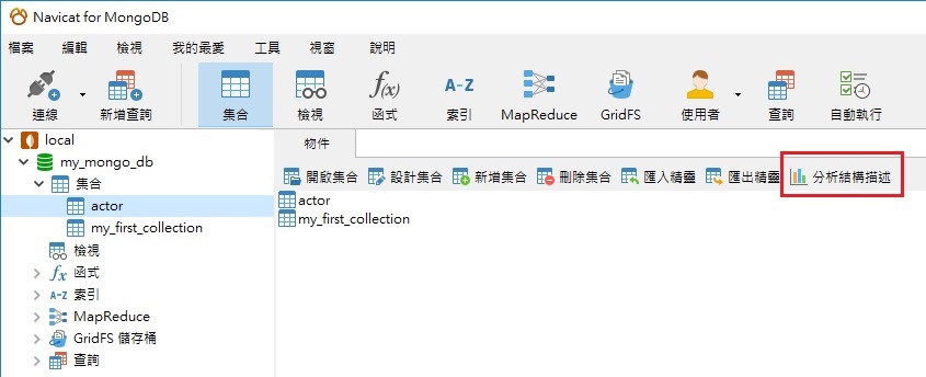 在 Navicat for MongoDB 的非 Essentials 版中,在物件樹中選取一個集合或一個檢視可啟用工具列上的「分析結構描述」按鈕:
